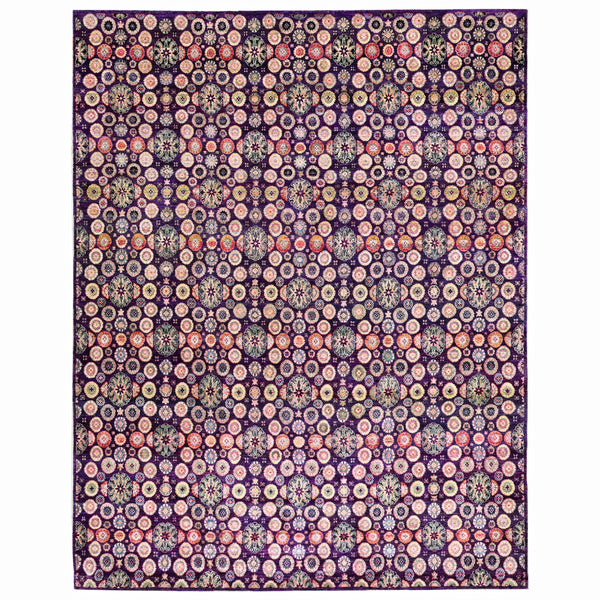 The Purple Alchemy Transitional Silk Rug measures 8'1" x 10'4", providing a substantial area coverage for various interior settings. This hand-knotted rug is constructed from 100% silk, offering a soft texture and a natural sheen. As part of the Alchemy Rug Collection, this piece features a distinctive pattern against a rich purple background. The design consists of a dense arrangement of concentric circles and detailed floral motifs. These elements are filled with a diverse palette of colors, including shades of...