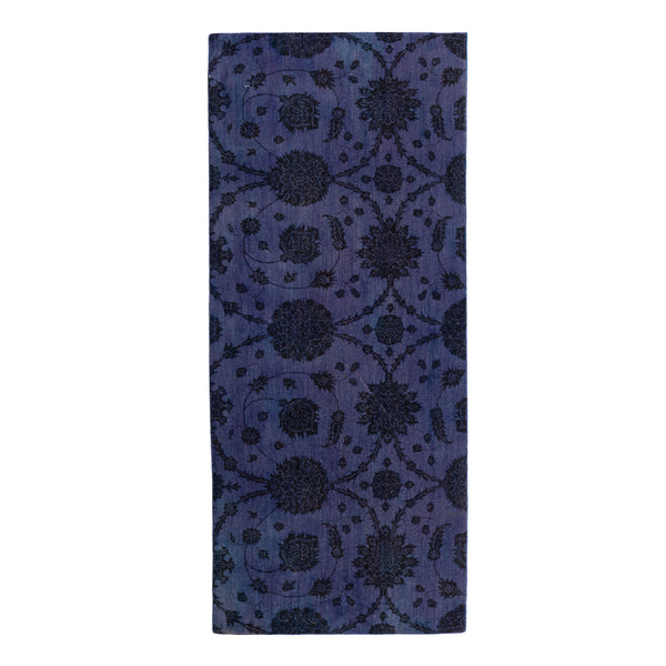 This hand-knotted wool runner, crafted in Pakistan, features a distinctive overdyed purple finish. Measuring 3'3" in width and 8'2" in length, it serves as a functional and decorative accent for various interior spaces. The runner's rich purple hue is achieved through a specialized overdying process. This technique layers a deep, muted purple over a traditional pattern, creating a unique, aged appearance. The underlying intricate floral medallions and scrolling vine motifs emerge in darker, more subdued shades of purple, providing a...