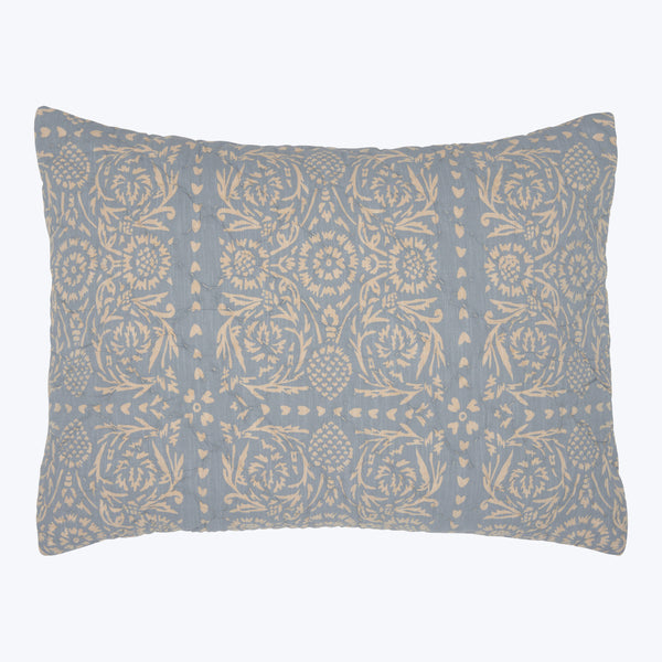 Discover the Raasia Woven Quilted Sham by John Robshaw. Hand-quilted on super soft cotton slub chambray, this beautiful sham’s whimsical pattern was inspired by antique painted tilework from Portugal. Available in Standard, King, and Euro sizes. Pair with the Raasia Woven Quilt.