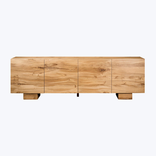 Designed by Thomas Bina and Ronald Sasson, this large-scale sideboard blends modern minimalist and Brazilian influences. Crafted from natural reclaimed French oak, its simple, minimal shaping lets the beautiful wood graining take center stage. The cabinetry features soft-close mechanisms, ensuring a smooth and quiet user experience. Perfect as a media console, an elegant entryway piece, or a stylish addition to your living room, this sideboard combines functionality with sophisticated design.