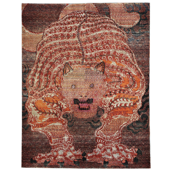 This Red Alchemy Contemporary Wool Rug features a fierce mythical creature design in vibrant red, orange, and brown hues. Hand-knotted in India, this 4'2" x 5'4" rug boasts intricate details and swirling patterns. The rich textures and high-quality wool material make this a striking and unique addition to any space.