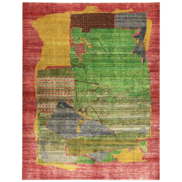 This Red Alchemy Contemporary Wool Silk Blend Rug is a stunning 7'9" x 10' piece from India. Hand-knotted with a mix of red, yellow, green, and gray tones in an abstract patchwork design, this rug exudes modern elegance. The intricate geometric shapes and textures add depth and character to this high-quality, luxurious transitional rug.