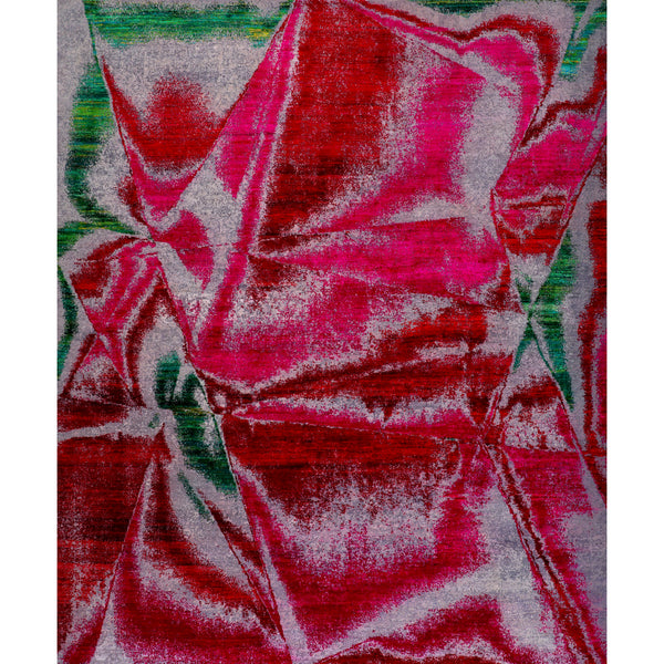 This contemporary hand-knotted rug measures 8'2" x 9'9", offering a substantial size for various living spaces. It features a striking abstract design, blending vibrant red and fuchsia tones with accents of green and soft, silvery-grey hues. The pattern creates a dynamic visual effect, suggesting movement and depth within its composition. Crafted from a blend of wool and silk, this rug combines the natural durability and resilience of wool with the subtle sheen and luxurious softness of silk. This material combination...