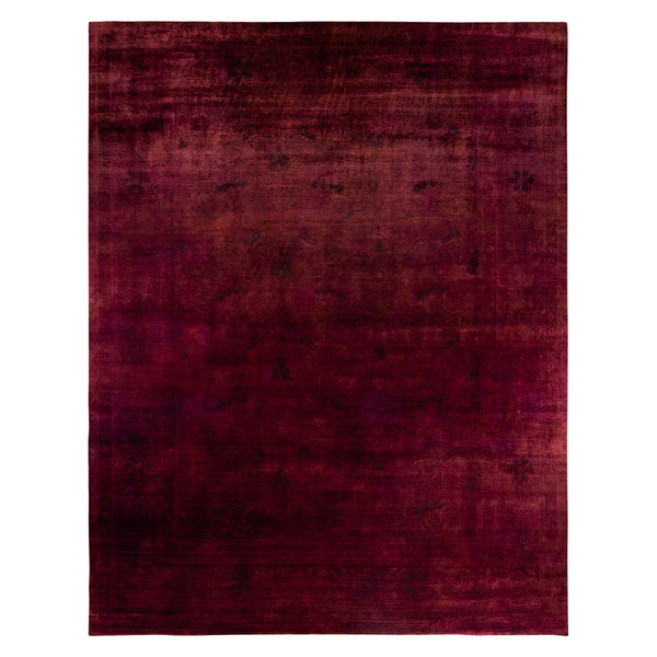 This large Red Overdyed Wool Rug measures 12'3" x 15', offering substantial coverage for expansive interior spaces. Hand-knotted from wool in Pakistan, this rug blends traditional craftsmanship with a contemporary finish. The overdyed technique gives this rug its distinctive character. An existing wool rug is first neutralized, then re-dyed with a concentrated color. For this piece, a deep red dye saturates the wool fibers, creating a vibrant, uniform hue that subtly mutes any original patterns. This process results in a...