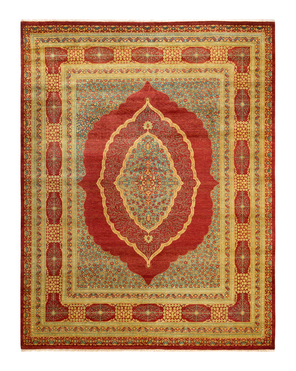 This Red Traditional Mogul Wool Rug, measuring 8'3" x 10'6", offers a blend of classic design and durable craftsmanship. Hand-knotted in Pakistan, this traditional rug features a rich red color palette and is constructed entirely from natural wool fiber. Its substantial size makes it suitable for larger living areas or dining rooms. The rug's hand-knotted construction ensures both durability and unique character. Each knot contributes to a resilient surface designed to withstand foot traffic, providing a long-lasting floor covering. Wool,...