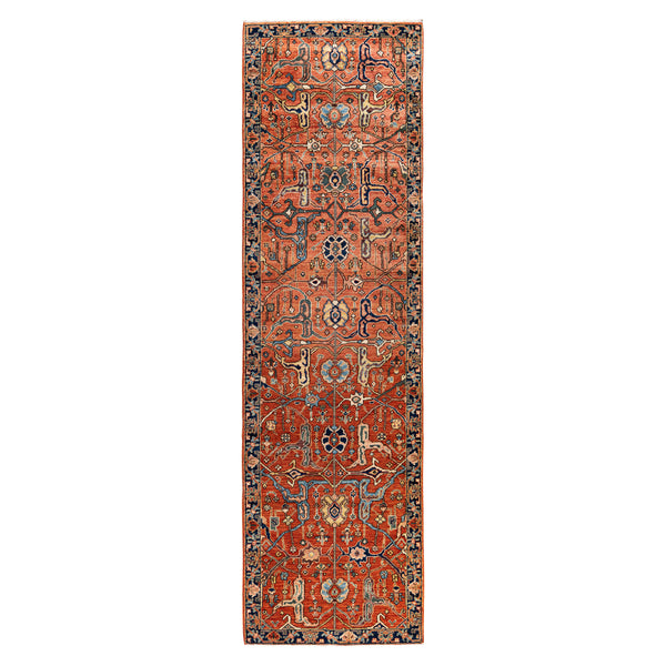 The Red Traditional Serapi Wool Traditional Runner - 2'9" x 9'8" showcases a rich red background with blue, cream, and green accents in a detailed floral and geometric pattern. Hand-knotted in Pakistan, this high-quality wool rug boasts intricate craftsmanship typical of Middle Eastern textile art.