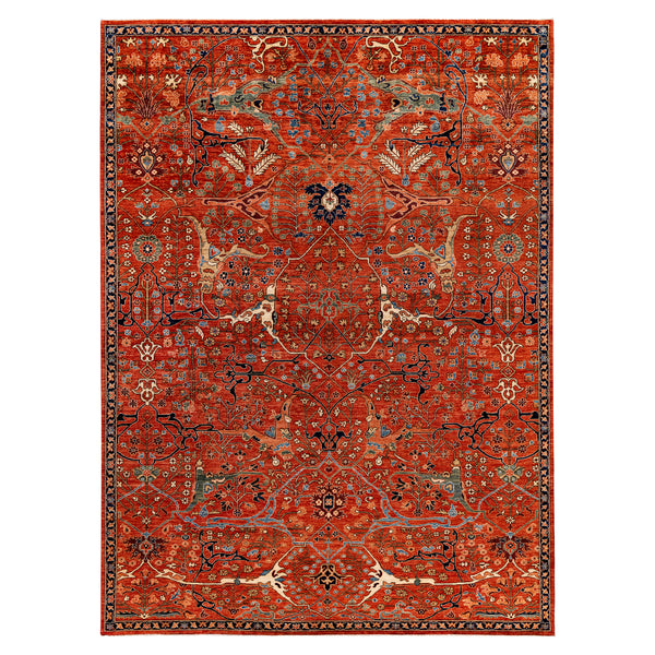 This hand-knotted Red Traditional Serapi Wool Rug measures 8 feet 10 inches by 12 feet, offering a substantial presence for various living spaces. Crafted from durable wool, it features a traditional Serapi design that originates from Pakistan. The rug's primary color is a deep, rich red, which serves as a vibrant backdrop for the intricate pattern. The design includes a large, open field with stylized floral motifs, scrolling vines, and subtle animal figures in shades of light blue, navy, cream,...