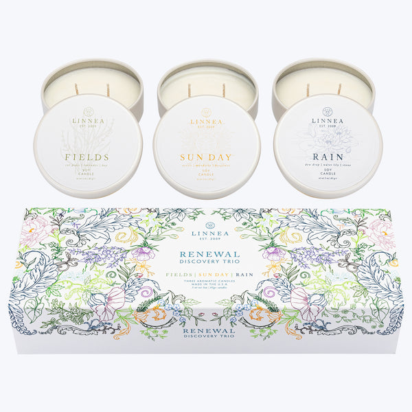Experience LINNEA's spring fragrances in a delightful new way. Featuring a curation of SUN DAY, RAIN, and FIELDS, the RENEWAL DISCOVERY TRIO allows you to savor each nature-inspired scent individually or burn two or more simultaneously to create a bespoke ambiance for your home. LINNEA candles are poured in small batches and crafted with renewable soy wax, all-natural cotton wicks, and the highest quality fragrant oils. All LINNEA home fragrances are non-toxic, eco-friendly, and cruelty-free. Sustainably made in the USA.