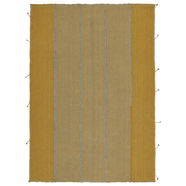 Handwoven from durable wool, this Contemporary Striped Kilim - 8'8" x 12' offers a modern take on classic panel weaving. This contemporary kilim rug showcases neutral beige and gold yellow stripes with light blue accents that live beautifully in the rich wool texture. The unique lightweight flatweave construction offers more durability than other handmade kilims of this size and sensibility. An heirloom-worthy piece, this kilim rug is an effortless way to introduce sophisticated geometrics, minimalist color, and storied wisdom into...