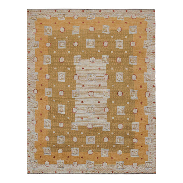 This Brown Modern Wool Silk Blend Rug - 9'2" x 12'2" retells a stunning time of history featuring all-over geometric and graphic Art Deco design elements with a neutral, balanced color scheme. This transitional Art Deco rug is hand-knotted from durable wool that boasts a minimalist Deco style from the 1920s that is perfect for the modern home.