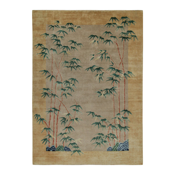 This traditional hand-knotted wool rug, originating from India, measures 10'1" in width by 14' in length. It features a warm, inviting design that complements various interior styles. The rug's central field displays a soft, neutral beige hue, providing a subtle backdrop for its prominent bamboo motif. Verdant green bamboo leaves and reddish-brown stalks are distributed across the field, with stylized blue and green elements resembling rock formations or water at the base of some clusters. A striking golden yellow border...