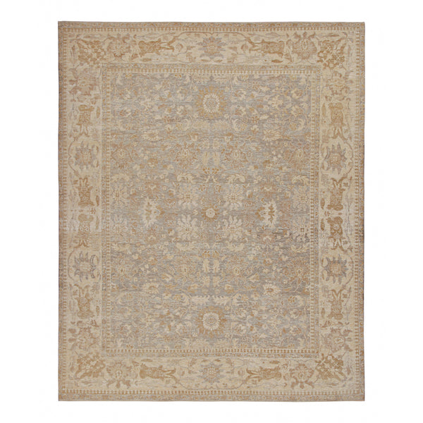 This traditional area rug measures 11'10" in width and 14'11" in length, making it suitable for large spaces. It is hand-knotted from 100% silk in India, ensuring both durability and a refined texture. The rug's design features a classic aesthetic with a versatile color palette. The detailed border showcases beige and ivory tones, framing a field with muted grey-blue undertones and intricate traditional patterns in complementary beige and gold shades. These motifs include a dense arrangement of floral and foliate...