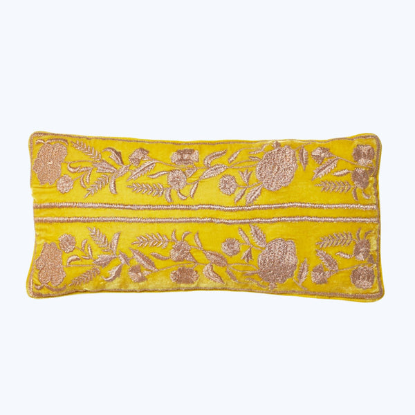The Saffron Sonata Pillow is a radiant blend of luxury and artistry, designed to transform any space into an elegant retreat. Handcrafted in India from 100% silk velvet, this rectangular pillow features a vibrant saffron-yellow hue adorned with intricate gold floral and foliage embroidery. Measuring 10” L x 20” W, the Sonata Pillow offers a plush, velvety texture that enhances its opulent charm. The garden-inspired motif is accented with meticulously detailed centers, creating a timeless statement of sophistication. A matching...