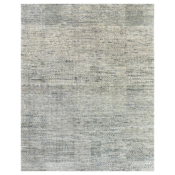 This Sage Contemporary Wool Silk Blend Rug is a hand-knotted masterpiece from India, measuring 8'4" x 10'2". This contemporary rug features a multi-tonal abstract design in shades of gray and off-white, with hints of darker streaks and lighter spots for depth. The soft and uniform texture, combined with the high-quality wool silk blend material, adds a touch of luxury to any space.