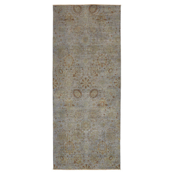 A striking blue overdyed wool rug. This one measures 4 feet 5 inches by 10 feet 9 inches. It captures a stonewashed aesthetic with modern flair. Crafted by hand in Pakistan, it marries durability with elegance—woven from robust wool that withstands time yet caresses the feet with surprising softness. There's something heartbreakingly beautiful in the way its grey hues perform on your floor, a subtle dance of shadows mimicking stories of eras past. Each thread whispers tales of quiet medallions...