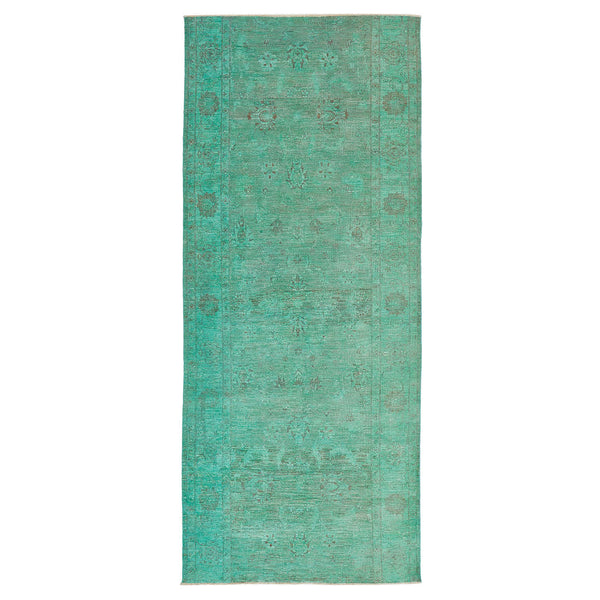 This hand-knotted wool rug—a vibrant 4'9" x 11'5" slice of artistry—injects a lush green splash into your home’s decor. Its overdyed design subtly resurrects intricate, traditional patterns, allowing them to whisper through the bold dye with a delicate patina. This isn’t just a rug; it’s a masterstroke of contrasts: contemporary in color but timeless in craft. Rooted in the skill of Pakistani artisans, every fiber tells a story with techniques honed through centuries. The natural wool promises resilience, resisting wear...