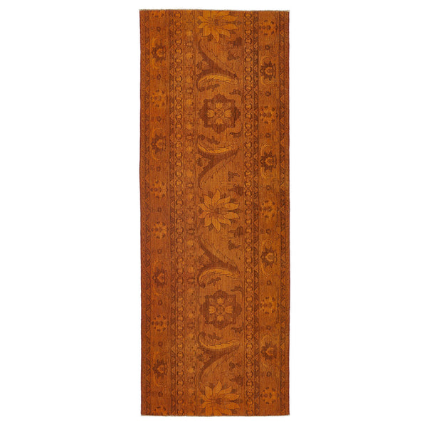 Bold, yet exquisite. This orange overdyed wool rug, stretching at 4 feet by 11 feet 5 inches, is a masterstroke in design—a runner that's as pragmatic as it is stunning. Positioned in a hallway, it thrives, transforming mere pass-throughs into articulated spaces. It warms entryways with aplomb and anchors living areas with a commanding yet stylish splash of terracotta, a hue mellowed by the art of overdying. This process breathes a sophisticated sheen onto its fibers, imparting a distressed aesthetic...