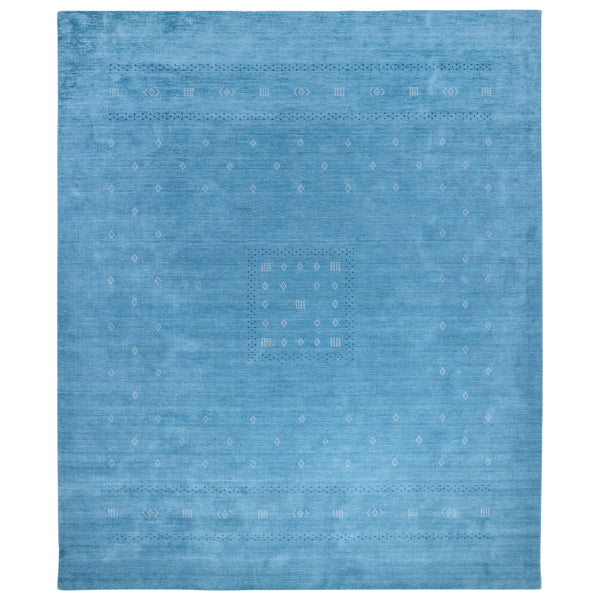 This Sapphire Solid Indo Gabbeh Wool rug is a luxurious 9' x 12' hand-knotted piece from India. The deep blue hue and subtle geometric patterns create an elegant and textured look. Crafted from high-quality wool, this rug exudes sophistication and style, making it a perfect addition to any interior design.