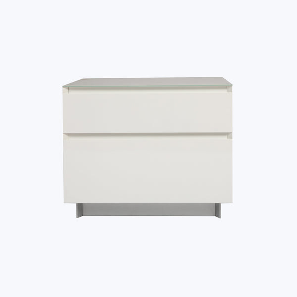 The Savvy Collection presents an impeccable choice of dressers and nightstands, designed to complement any upholstered bed with seamless elegance. Featuring soft-close drawers that ensure a tranquil environment by minimizing noise, this collection enhances the serenity of your space. Each nightstand and chest is crowned with tempered glass tops, providing both durability and a sleek aesthetic. The brushed steel-look base lends a sophisticated, modern edge to the design, while the high-gloss lacquer finish not only offers a luxurious sheen but...