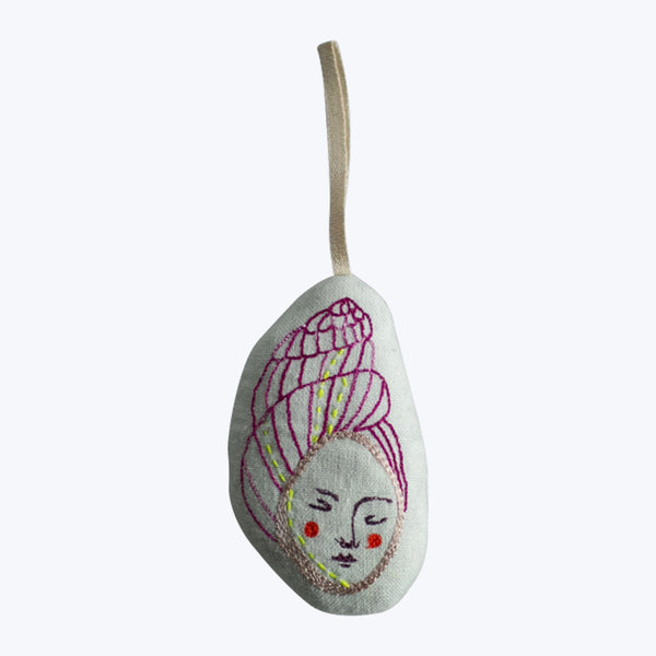 This sweet little shell person is machine embroidered in dark magenta thread on a soft blue linen. This token is stuffed with organic cotton and French lavender— a scent known to relieve feelings of stress. Hung with natural twill tape. Hand embellished with neon green embroidery. Enchant year-round with these nostalgic tokens as gift toppers, sachets for drawers, holiday ornaments, or simply whimsical decor. Magical creations constructed of cloth with care for your delight. *Due to fragility or removable parts, this handmade ornament is...