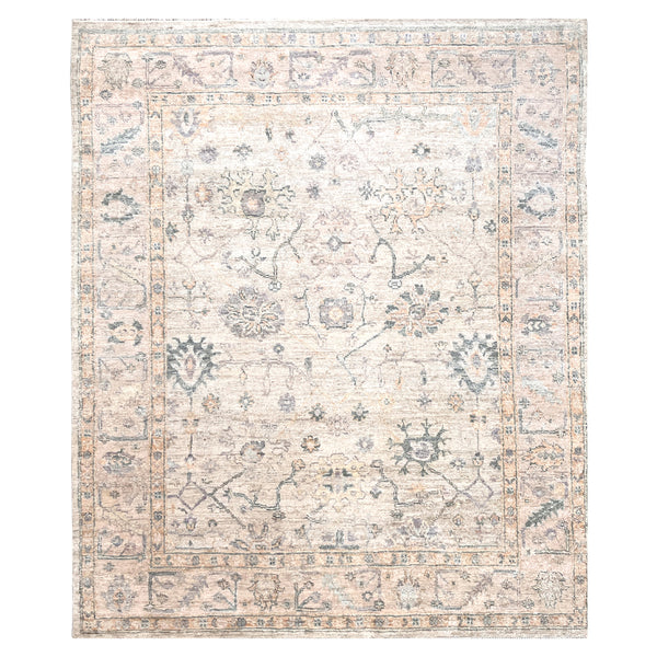 This Beige Traditional Oushak Silk Rug - 8' x 10' showcases a faded, vintage design with intricate patterns and motifs. Muted shades of beige, pink, blue, and gray give it a weathered look. Hand knotted out of luxurious silk in India, this traditional rug adds warmth and elegance to any room with its detailed border and symmetrical arrangement.