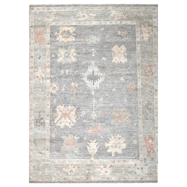 The Light Grey Traditional Oushak Silk Rug is a 9' x 12' rug from India. Hand-knotted out of silk, this ornate piece features a muted color palette of grays, beige, and hints of faded coral. The intricate floral and geometric pattern adds elegance to any room, while the distressed look gives it a vintage aesthetic. The detailed design on the border frames the central pattern beautifully, making this rug a high-quality and luxurious addition to your home.