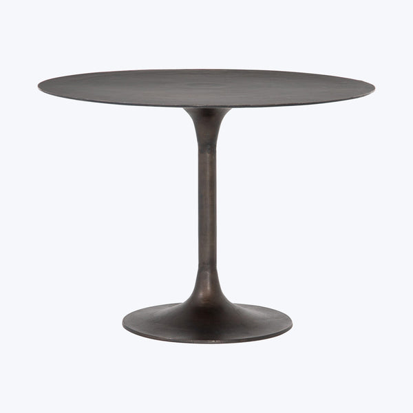 Classic tulip shaping in textural cast-aluminum makes for a modern bistro table. Finished in antique rust to bring out alluring highs and lows. Great indoors or outdoors.