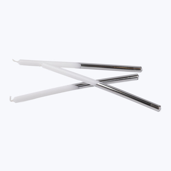 Brighten up your entryway or dinner party table setting with this set of 3 dip-dyed metallic chrome taper candles. Pink Stories Candles are handmade, making each color the same but every pattern special and unique. Dyed in cooperation with social institutions in the beautiful foothills of the Alps. 100% Vegan.