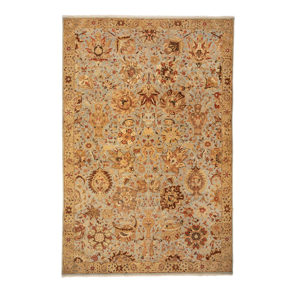 This Beige Traditional Wool Rug - 6' x 9' showcases an intricate floral and botanical design in earthy tones of beige, brown, and orange. Hand-knotted in India with high-quality wool, this traditional rug exudes classical Persian influences and features a luxurious texture. Perfect for adding a touch of elegance to any room.
