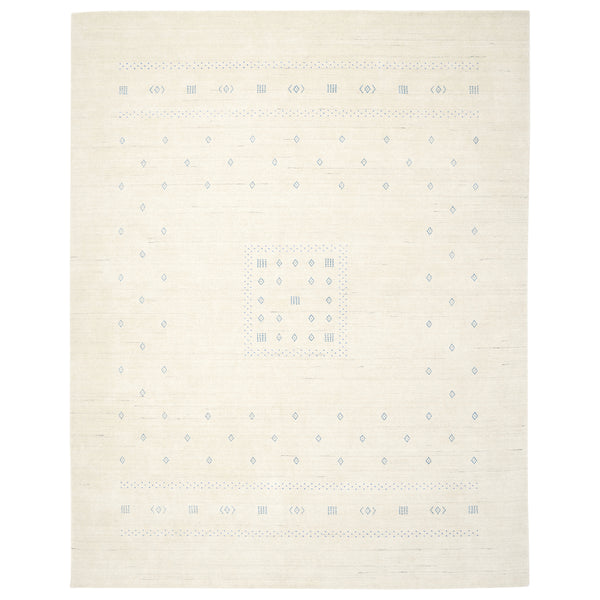 This Snow Brown Solid Indo Gabbeh Wool rug is a 9' x 12' hand-knotted beauty from India. Its minimalist design features a neutral cream base with blue geometric patterns. The soft texture and high-quality wool make it a versatile and elegant addition to any room.