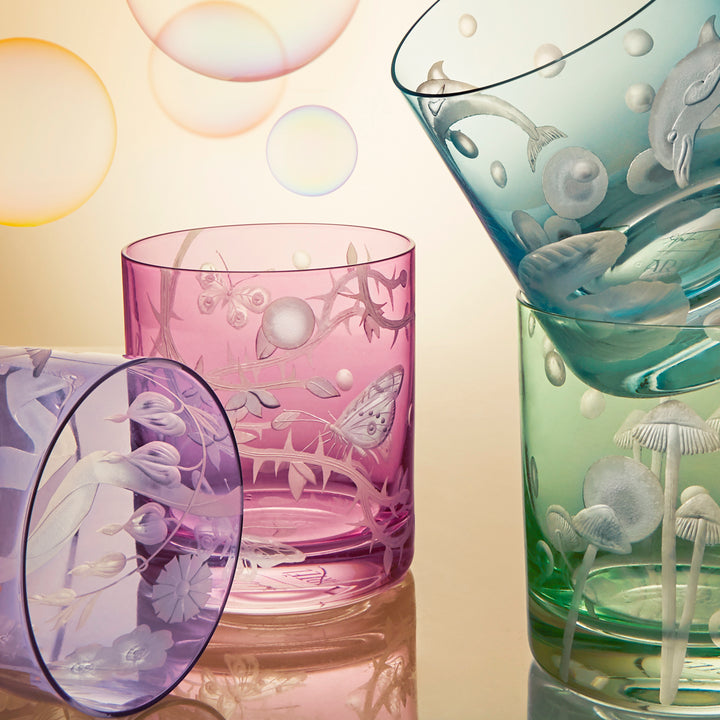 Named for the Cold Ware era of competition between the USA and USSR over spaceflight capability, the Space Race collection of old-fashioned glasses and decanter is compromised of two separate motifs: Sputnik features an image of the famous Soviet satellite in flight, careening past glittering gold stars and planets, while Apollo 11 depicts a space-suited American astronaut standing near a lunar landing module with a magnificent earthrise looming in the background.