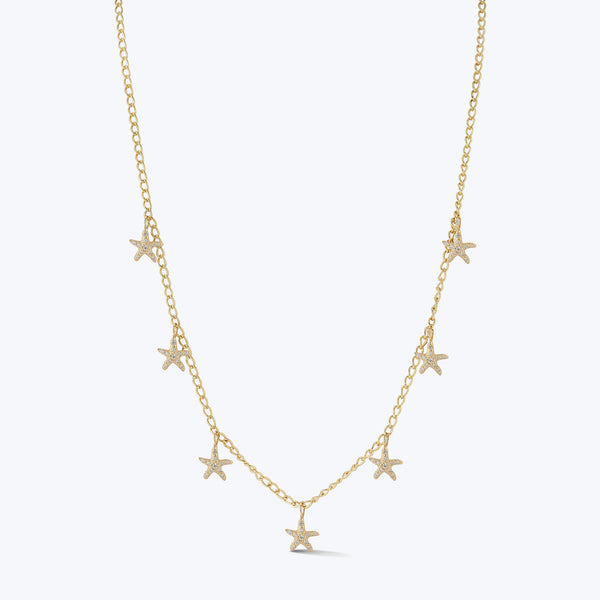 The Starfish Fringe Necklace is a perfect gift for the person you're starry eyed for. This charm necklace features (7) 18k yellow gold starfish with diamonds on a thick gold chain. Renna Jewelry showcases the highest quality pieces for the modern woman — nostalgically chic and eclectically elegant. Adjustable 15-16". .28 carat diamonds.
