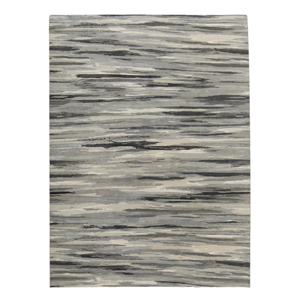 This 9' x 12' Charcoal Contemporary Tibetan Wool Silk Blend Rug offers a modern design and refined texture, suitable for various interior settings. Its large dimensions make it an ideal anchor piece for spacious rooms, defining areas with both style and comfort. The rug features an abstract pattern characterized by horizontal bands and brushstroke-like elements. The color palette includes multiple shades, predominantly charcoal and various greys, interspersed with lighter cream or off-white tones. This combination creates a dynamic visual effect,...