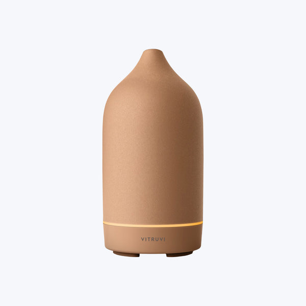 SpecificationsThe Stone Diffuser is ultrasonic, meaning it uses water and vibrations instead of heat. To use the Stone Diffuser, simply fill the water reservoir to the fill line and add 20-30 drops of Vitruvi essential oils. Then put the plastic cap and the ceramic cover back on, and select your time setting.