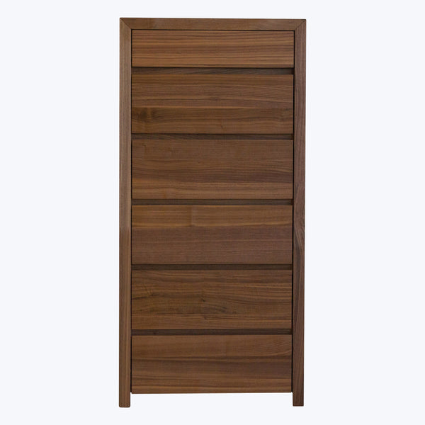 Crafted with exquisite walnut veneer, the Stowe Night 6-Drawer Chest exudes timeless sophistication, adding a touch of warmth to your sleeping sanctuary. Its rich wood grain and sleek design create a harmonious blend of modernity and classic charm.