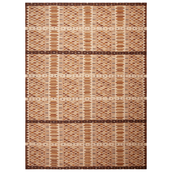 This large Brown Geometric Swedish Kilim Rug measures 10'3" x 14'2", providing substantial floor coverage for various living spaces. It is a hand-woven flatweave rug crafted from 100% wool, known for its inherent durability and resilience. Originating from India, this Kilim rug blends traditional weaving methods with a distinct geometric design. The rug features a detailed pattern in a palette of brown, beige, and cream tones. The main field displays alternating vertical columns of diamond motifs and slender vertical line...