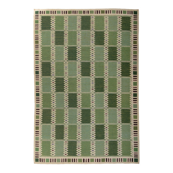 Inspired by Swedish Deco designs, this Green Mid-Century Flatweave Wool Rug - 10' x 14' is handwoven from durable wool while remaining soft underfoot. A beautiful addition to the minimalist or mid-century modern home, this traditional kilim rug is symmetrical and well-balanced with a geometric motif in multiple shades of green, brown, and cream. Kilim rugs are traditional flatwoven foundations that are cherished for their versatility and lightweight nature.