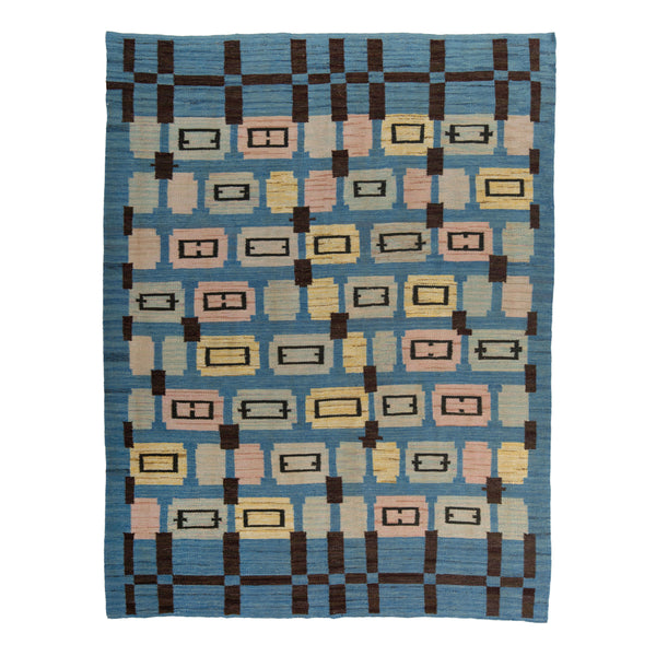 Inspired by Swedish Deco art designs like Spice Hall from Judith Johansson, this Blue Mid-Century Flatweave Wool Rug - 8' x 10' is handwoven from durable wool while remaining soft underfoot. A beautiful addition to the minimalist or mid-century modern home, this traditional kilim rug is symmetrical and well-balanced with a rectangular geometric motif in multiple interwoven shades of blue, pink, brown, teal, and yellow. Kilim rugs are traditional flatwoven foundations that are cherished for their versatility and lightweight nature.