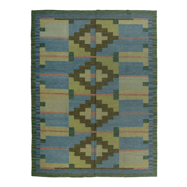 Blue and Green Mid-Century Flatweave Wool Rug - 9' x 12'