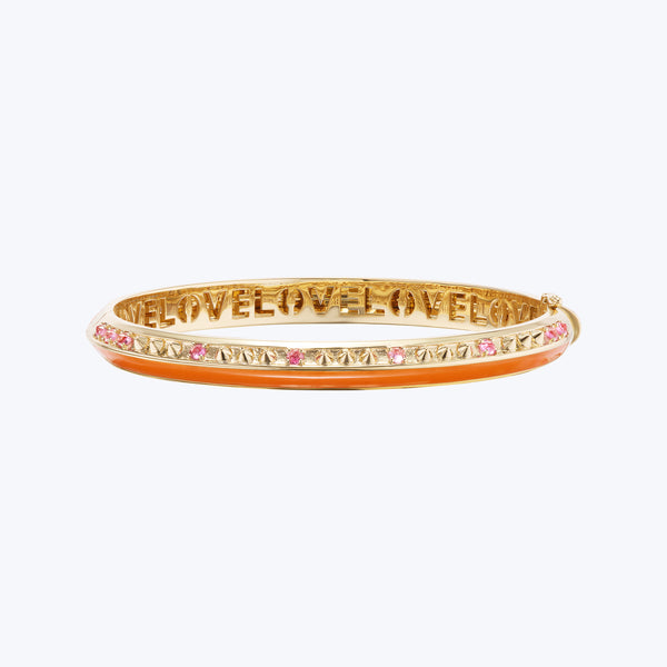 The Sweet, Happy Life Pink Tourmaline bangle is rafted in a vibrant 18k yellow gold with inverted Pink Tourmaline and playful orange enamel. Inspired by the joy and effervescence of the combined colors of pink and orange - with a little spiky attitude.