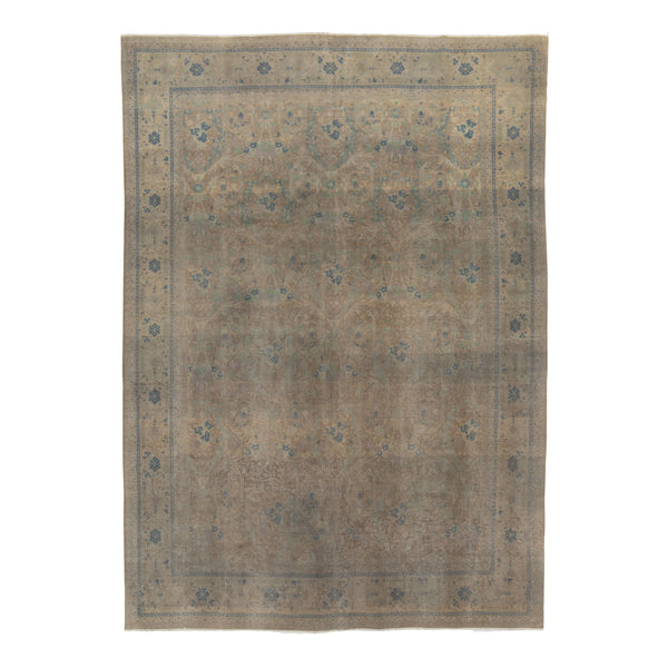 This Blue Tabriz Vintage Rug - 8'3" x 11'6" features lovely earth tones and hints of blue in a geometric and floral pattern. Hand-knotted with high-quality, long-lasting wool in Central Asia, this piece is sure to add elegance and vintage charm to any interior.
