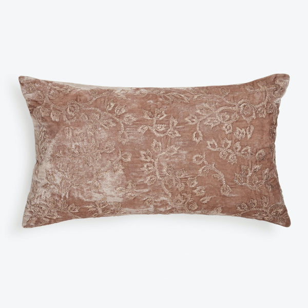 Introducing the Woods Pillow, a rectangular decorative pillow showcasing an intricate floral pattern in shades of brown or taupe. Its light, neutral background color enhances the traditional aesthetic, while the finished edges with matching piping give it a tailored look. Crafted in India from 100% silk velvet, the texture and quality of this high-end pillow are unmatched. Add a touch of elegance to your space with this exquisite piece measuring 12 L x 20 W.