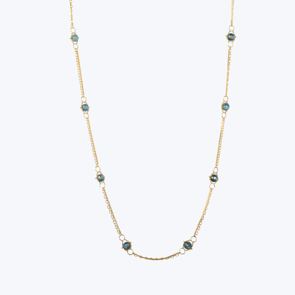 Discover the Textile Necklace in London Blue Topaz by Amáli. Featuring a long, exquisitely crafted 18K gold chain, this refined necklace is dotted with London blue topaz, believed to represent emotional strength, wisdom, and insight. An elegant piece, combining delicate design with meticulous, artisanal craftsmanship. Wear it solo or layered. Handcrafted in the USA.
