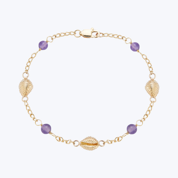 The perfect surfer girl chic look lies ahead with the Blake Bracelet adorned with amethyst and classic coffee bean shells on a timeless link chain. Renna Jewelry showcases the highest quality pieces for the modern woman — nostalgically chic and eclectically elegant.
