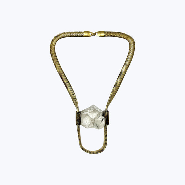 The Flame Necklace is made of hand-sculpted epoxy with gold dust and a Brazilian quartz cluster finished with a protective resin coating on a high quality vintage and nickel-free brass herringbone chain. Brazilian Clear Quartz helps the wearer attune to their higher self while protecting against negativity. Elena Lyakir is an NYC-based contemporary metaphysical jewelry artist by way of Ukraine. Her mystical influence is translated into wearable art through the creation of her chic line of statement jewelry that's bold,...