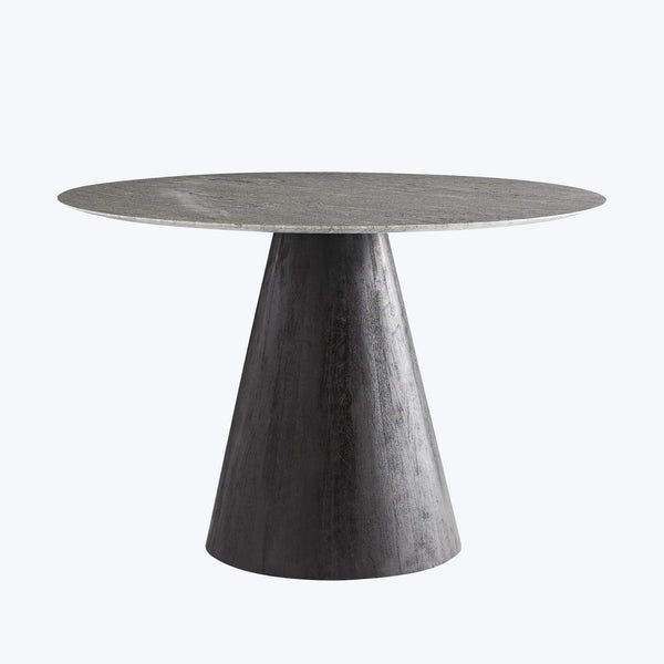 Traditional design and mixed materials compose the clean-lined silhouette of our Theodore Dining Table. A round gray solid marble top is fashioned to a tapered wood base that has been sandblasted in an ebony finish. The beveled edge of the marble top adds depth and dimension while the dark stain of the finish accentuates the wood's natural textures. The natural composition and height give this dining table a modern edge. Marble may vary.