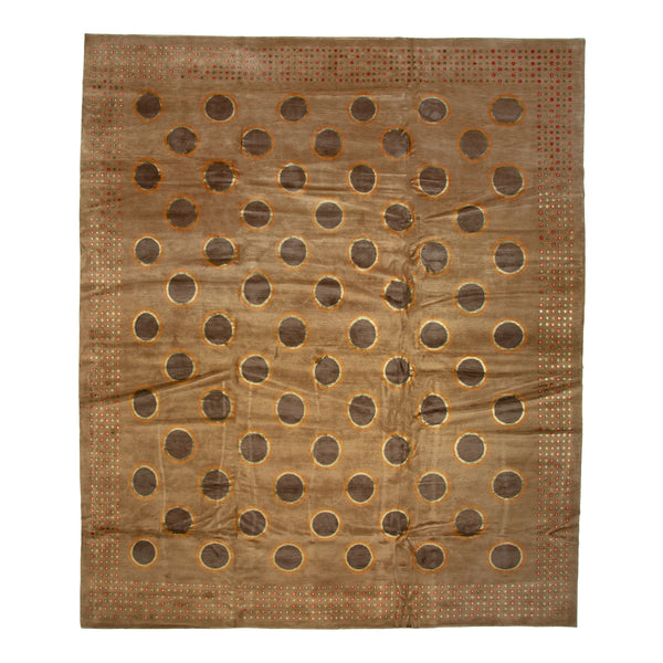 This isn’t just an ordinary rug; it’s a bold statement in gold and brown. A hand-knotted masterpiece from Nepal, it spans 13'8" x 16'4", commanding the floor of any spacious living area or open-plan room. Its modern edge comes alive through a geometric medley of dark brown circles, each embraced by a confident gold ring. The allure lies in its asymmetry of simplicity and complexity—where large forms settle into a detailed collage of gold and brown squares, subtle red whispers...