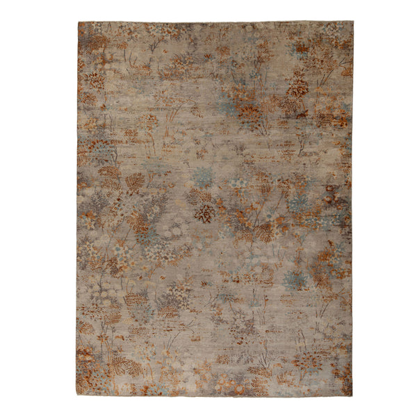 This Multicolored Samoke Transitional Wool Silk Rug - 9' x 12'1" is a smoldering blend of neutral greys, sandstone orange, soft blue, and red hues within an abstract floral design, a reinvention of traditional motifs rendered contemporary through a unique distressed effect. The muted motif adds a timeless sophistication to any room with a soft, shifting sheen that catches the light as you view it from different angles thanks to its silk construction while remaining durable enough for daily use...