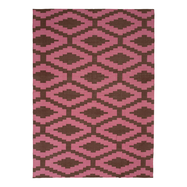 The Pink & Brown Geometric Cotton Rug does more than just cover a floor; it transforms a space into a gallery of bold, contrasting colors and patterns. Its expanse, at 10 feet by 14 feet 2 inches, demands attention and insists on being the centerpiece in open-concept living areas, expansive dining rooms, or grand master bedrooms. The rich brown geometric shapes seem to dance across the rug, playing against a vibrant pink background that breathes life into any setting—a delightful...