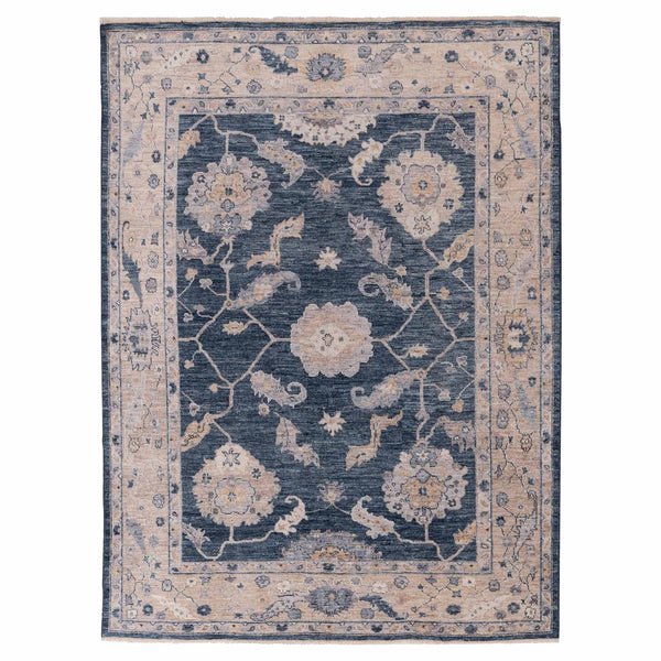 This hand-knotted Oushak wool rug, measuring 8'1" x 9'6", brings a traditional aesthetic to diverse interior spaces. Originating from Turkey, this piece showcases a classic design crafted from durable wool. The rug features a deep blue field, providing a rich backdrop for its intricate pattern. A central, stylized medallion in shades of beige and light blue anchors the design. Flowing floral motifs and delicate vine patterns, also rendered in beige and light blue, extend across the field. A wide, contrasting...